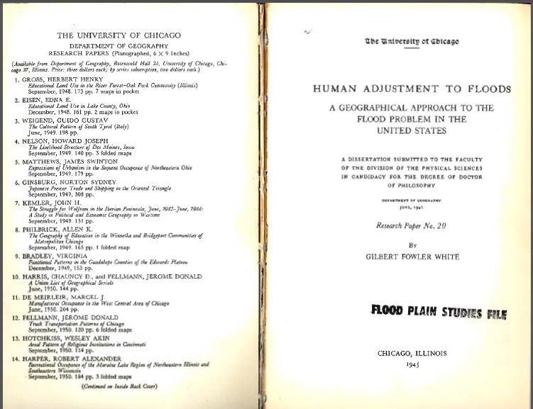 Przełomem stała się praca doktorska White’a zatytułowana „Przystosowanie ludzi do powodzi, geograficzne podejście do powodzi w USA” opublikowana w 1945 roku. Dzisiaj uważana jest za pracę, która wywarła największy wpływ na sposób myślenia o ograniczaniu skutków powodzi i praktykę działania w tej dziedzinie w Ameryce i na świecie.